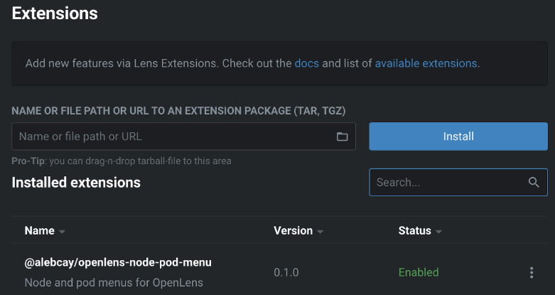 2. @alebcay/openlens-node-pod-menu 입력 후 설치